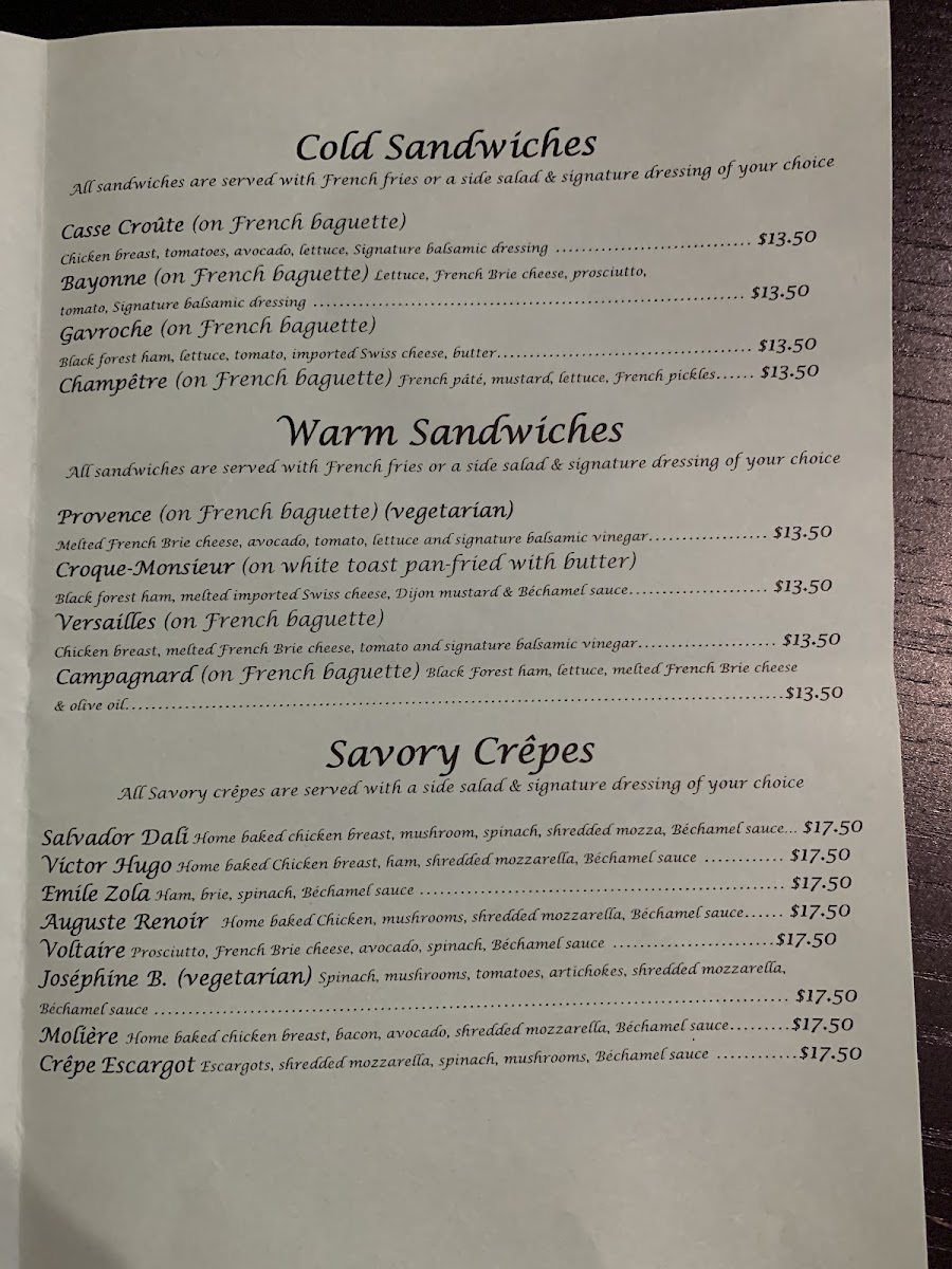 The menu is a culinary journey, featuring a tempting selection of warm sandwiches, salads, and savory crepes. For lunch, you might choose the Campagnard sandwich, adorned with black forest ham, fresh lettuce, and a melty French brie. For a vegetarian option, the Provence with creamy brie, avocado, and signature balsamic dressing is a must-try. Each dish is crafted using fresh, high-quality ingredients that amplify the authentic flavors.